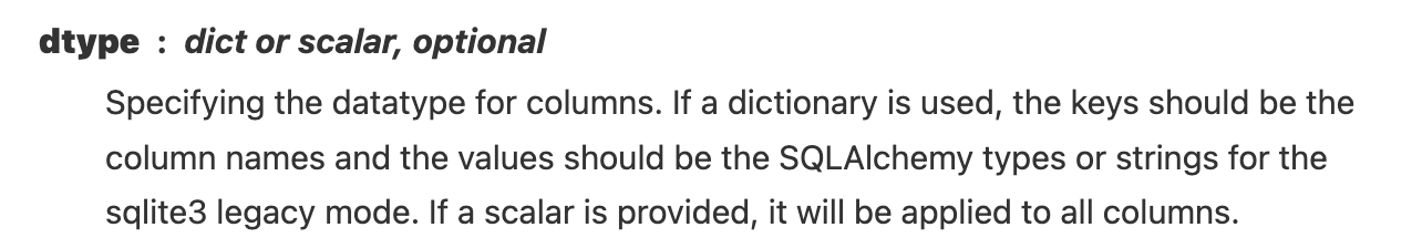 dtype파라미터를 이용하면 아래와 같이 dict형태로 타입을 지정할 수 있는데요. 아래와 설명과 같이 sqlalchemy내의 type들로 설정 가능한 것 같습니다. 모든 타입의 sql에서 지원하는지는 잘 모르겠네요. to_sql메서드를 지속적으로 사용하려면 sqlalchemy내에 어떤 타입을 지원하는지도 숙지하고 있어야 할 것 같네요.