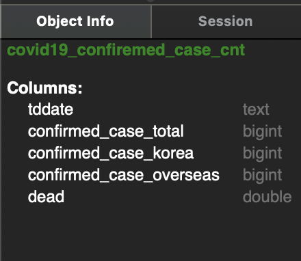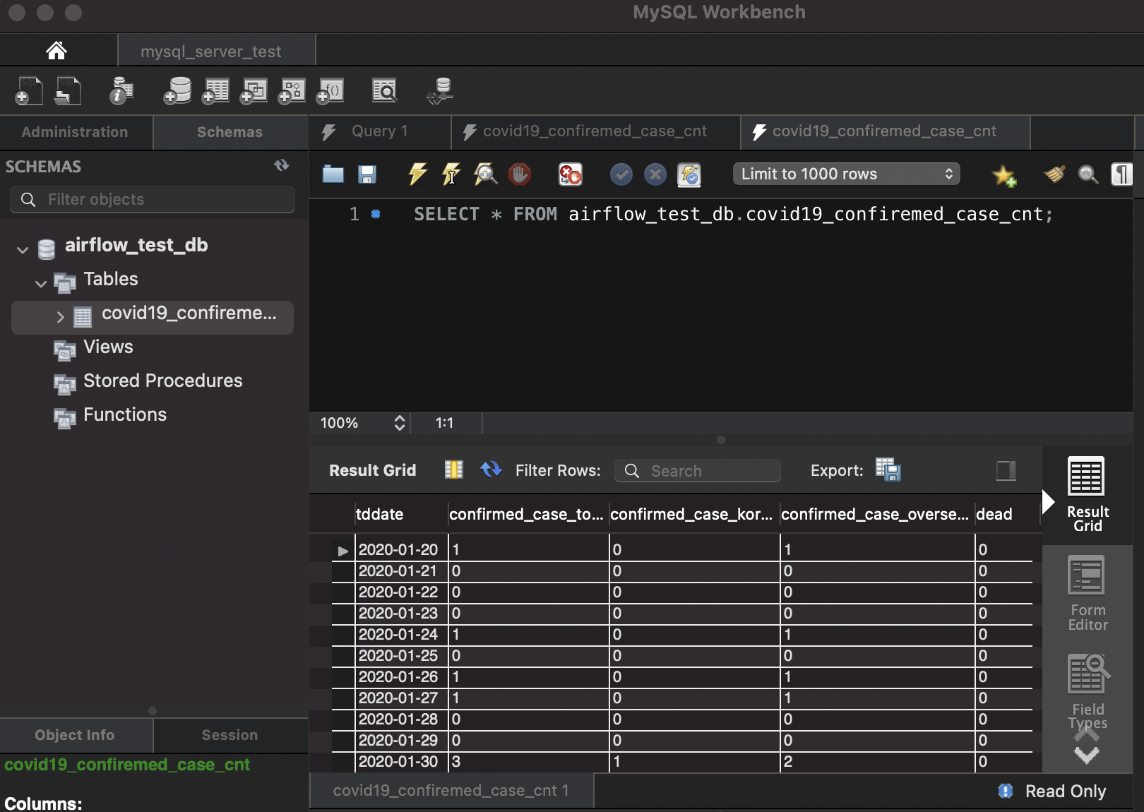 Workbench내에서 SCHEMAS를 클릭하면 Tables 하위에 covid19_confirmed_case_cnt 테이블이 생성된것을 알 수 있습니다. 쿼리도 정상적으로 동작하네요. (쿼리는 작성후 번개 버튼을 클릭하거나 드래그 후 crtl(command)+enter를 입력하시면 됩니다.)