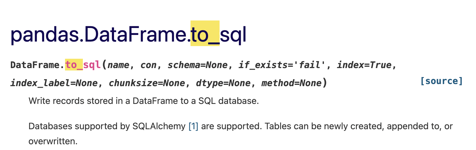 그런데, mysql.connector로 데이터 프레임 전체를 DB로 적재하는 과정은 꽤나 귀찮았습니다. 보통 for문으로 row하나 하나 insert하던데 속도는 둘째 치고 코드를 작성하는 과정이 문득 귀찮게 느껴졌습니다. 그래서 좀 더 찾아보니 pandas내에 to_sql이라는 메서드가 있더라구요!