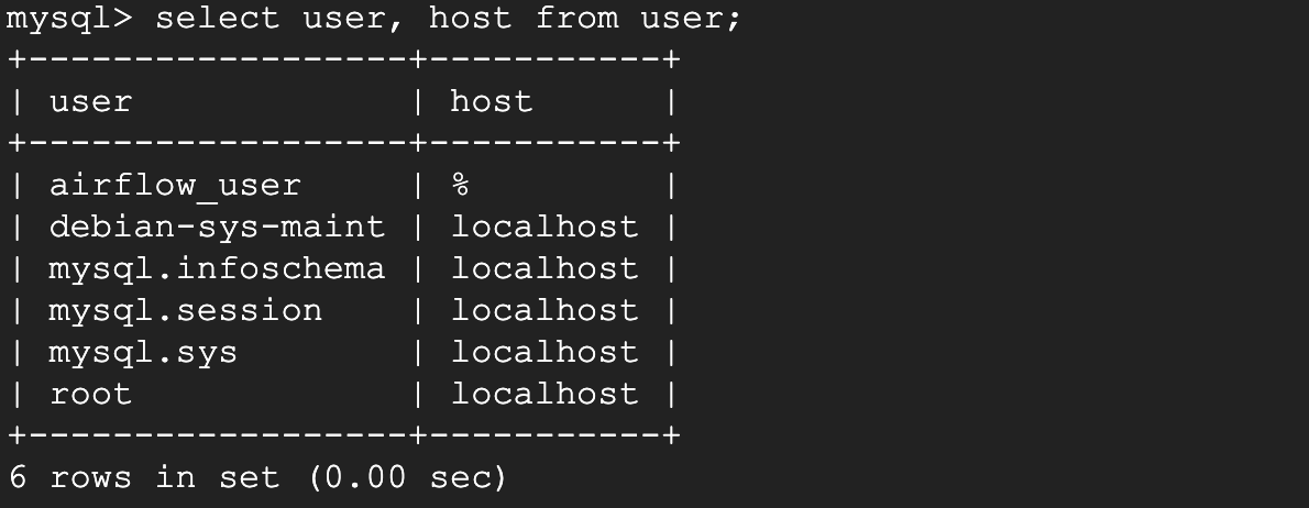 다음으로, airflow_test_db에 대해 계정이 모든 권한을 가질 수 있도록 설정해줍니다.