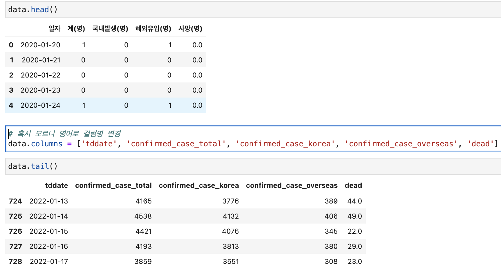 data = pd.read_csv("https://raw.githubusercontent.com/ddongmiin/deepPythonAnalysis/master/interpretation/covid19_korea.csv"