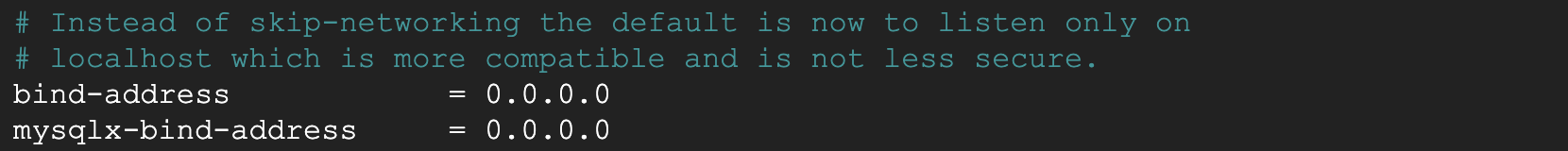 여기서 아래와 같이 bind-address와 mysqlx-bind-address를 모두 0.0.0.0으로 수정해줍니다.