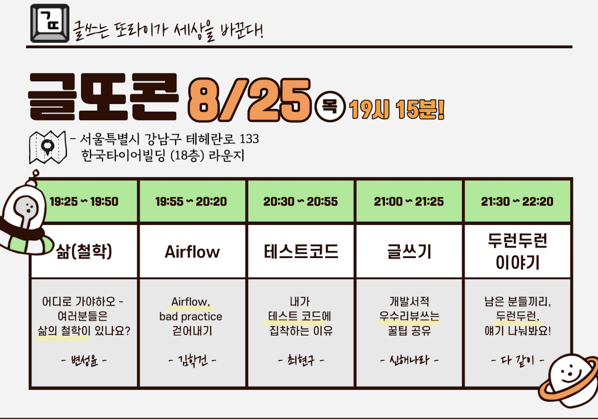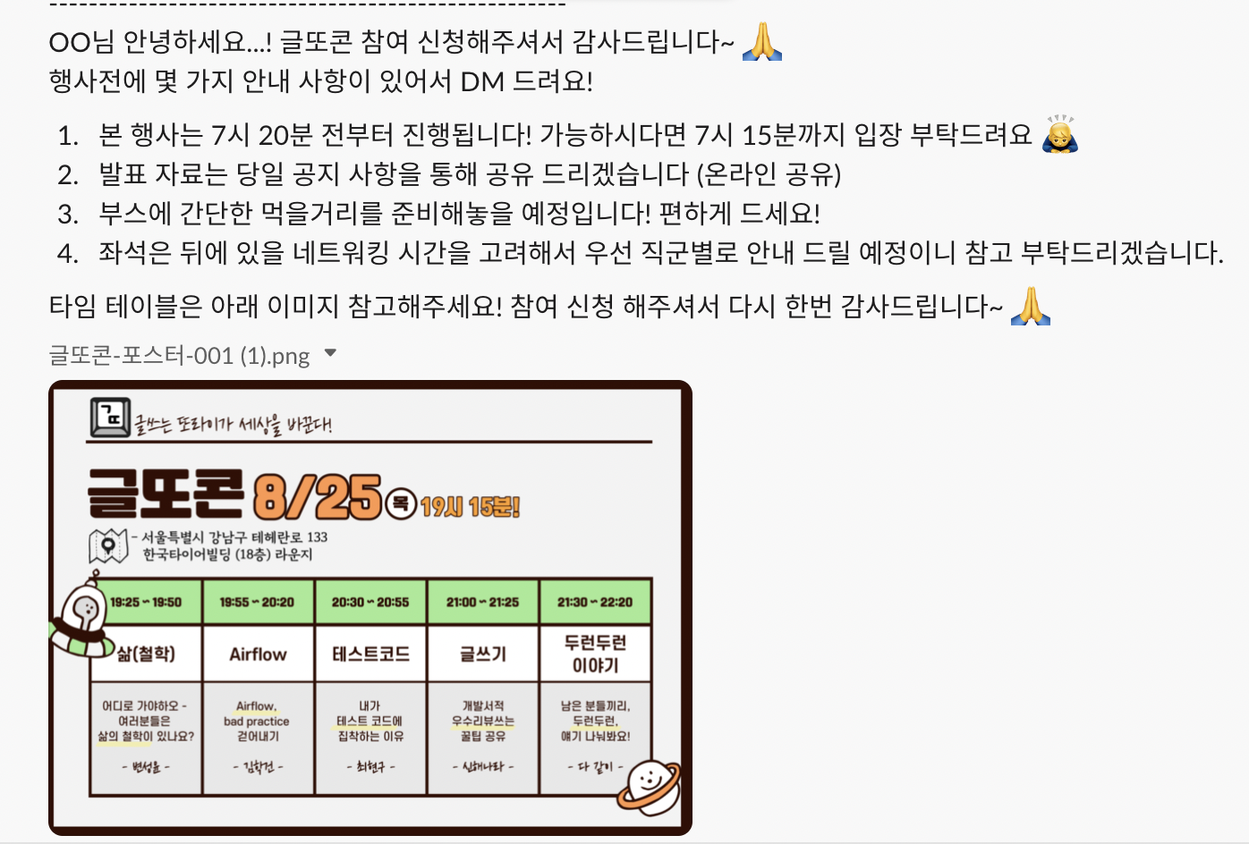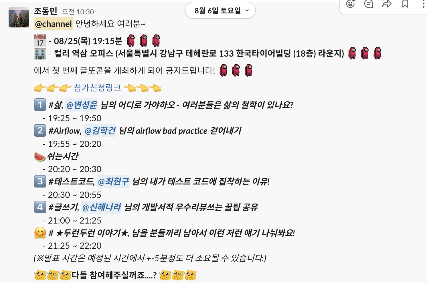 두 번째는 발표자 모집! - 발표자 모집은 별도 채널에서 쓰레드를 통해 진행했는데 나라님/학건님/현구님/성윤님 이렇게 네 분이 8월 글또콘 발표자로 신청해주셨다. 세 번째는 네트워킹! - 7월에 별도 운영진 회의를 하기도 했었고, 쓰레드를 통해서도 논의했다. 그러다가, 성윤님이 그냥 두런 두런 얘기하면 되지 않을까요....? 라는 말씀을 주셨고, 성윤님 얘기를 듣고보니 그냥 그래도 되겠다는 생각이 들었다. 그리고, 두런 두런이라는 이름도 마음에 들었다 ㅋㅋㅋ 그렇게 탄생한 글또콘 타임테이블~