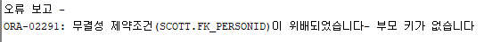 1. 부모 테이블의 기본키(PK)에 없는 값을 자식 테이블에 추가하면 에러가 발생 한다.