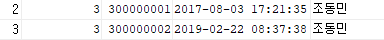 VALUES(3, 300000002, '2019-02-22 08:37:38', '조동민', '분당구', '마우스', 11000, 1);