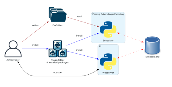 여기서, dags폴더는 앞서 우리가 말한 DAG(=여러 작업들의 집합)이 모여있는 폴더이다. 그럼, Aiflow는 어떻게 dags안의 파일들을 읽어들일까? Architecture Overview 에는 아래와 같이 가장 간단한 버전의 Airflow 배포 과정이 설명되어 있다.