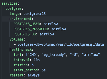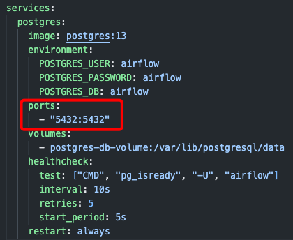 파일을 다운 받으면 폴더에 docker-compose.yaml파일이 생기는데, 원래 파일안에는 postgres DB의 포트 번호가 없다.(왼쪽 사진) 본 글에서는 postgres DB에 데이터를 적재하고 당겨오는 과정을 설명하지는 않지만, 다른 예제들에서 종종 설명하므로 아래와 같이 docker-compose.yaml 파일 안에 5432포트 번호만 추가해주자(오른쪽 사진).