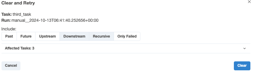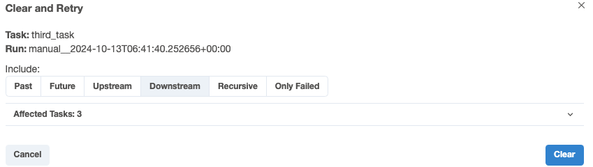 Airflow는 webserver안에서 유연한 데이터 재처리를 지원한다. third_task를 클릭 후 clear task를 누르면 Clear and Retry화면이 나온다.