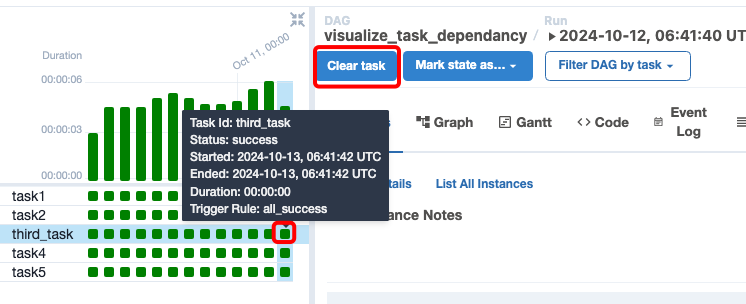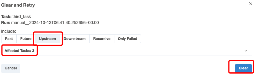 여기서, Upstream을 체크하면 Affected Tasks가 3개가 되고, Clear를 누르면 third_task포함 상위 task(=이전에 실행되어야 할 task)들만 재실행 하는 것을 알 수 있다.