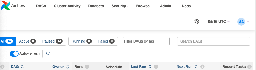http://0.0.0.0:8080/home을 크롬에서 실행 >> 유저네임/패스워드 airflow입력 하면, 아래와 같은 Airflow 웹서버에 접속할 수 있게 된다.