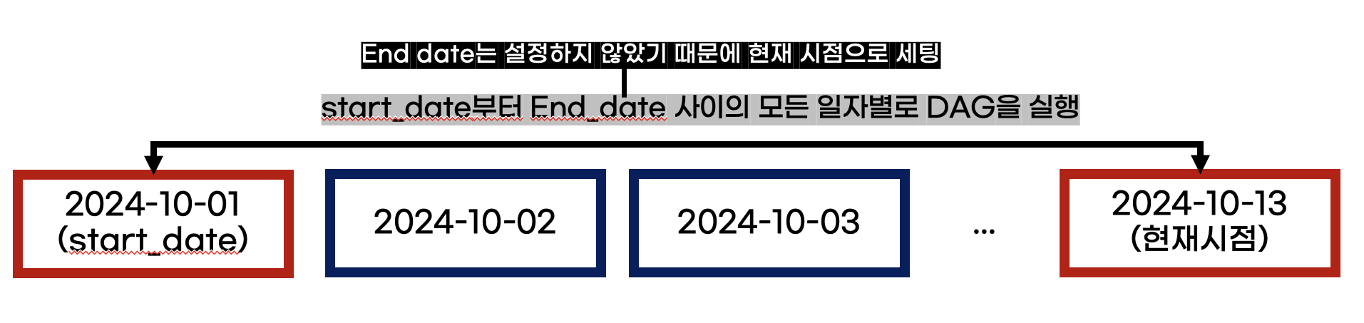그 이유는 Catchup이라는 기능 때문인데, 실행 일자(=이 글을 쓰는 시점)가 10/13일 이므로 start_date부터 실행 일자까지 일별로 dag을 한번씩 실행했기 때문이다.