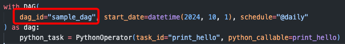 with DAG(dag_id="sample_dag", start_date=datetime(2024, 10, 1), schedule='@daily') as dag: