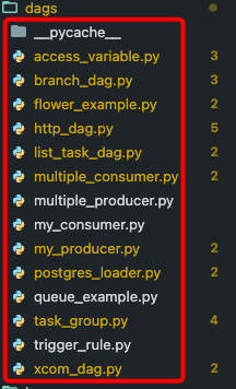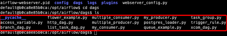 그리고, 아래와 같은 명령어를 통해 airflow 웹서버 도커 컨테이너 안으로 들어가서, /opt/airflow/dags 폴더 안에 아래와 같이 로컬 .(=현재경로)/dags폴더 하위와 똑같은 파일들이 있는 것을 알 수 있다. (세부 항목 안의 파일들은 실리콘벨리 엔지니어와 함께하는 Apache Airflow 강의의 예제 파일들 입니다.)