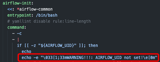 AIRFLOW 도커 컨테이너를 실행하는 사용자 UID를 지정하는 과정이다. docker-compose.yaml의 하단 부에 보면, 세팅하지 않을 시 아래와 같이 경고 메시지를 노출하도록 설정되어 있으니, 세팅해주고 넘어가자.