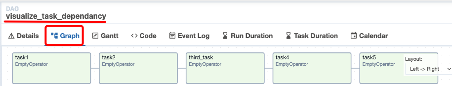 task1다음에, task2를, .... task4다음에 task5를 마지막으로 실행하려면 위와 같이 >>으로 작업 간의 관계를 표시해주면 된다. https://0.0.0.0:8080에 접속후 visualize_task_dependancy를 클릭후, Graph를 눌러주면 아래와 같이 실행 순서가 표시된 것을 알 수 있다.