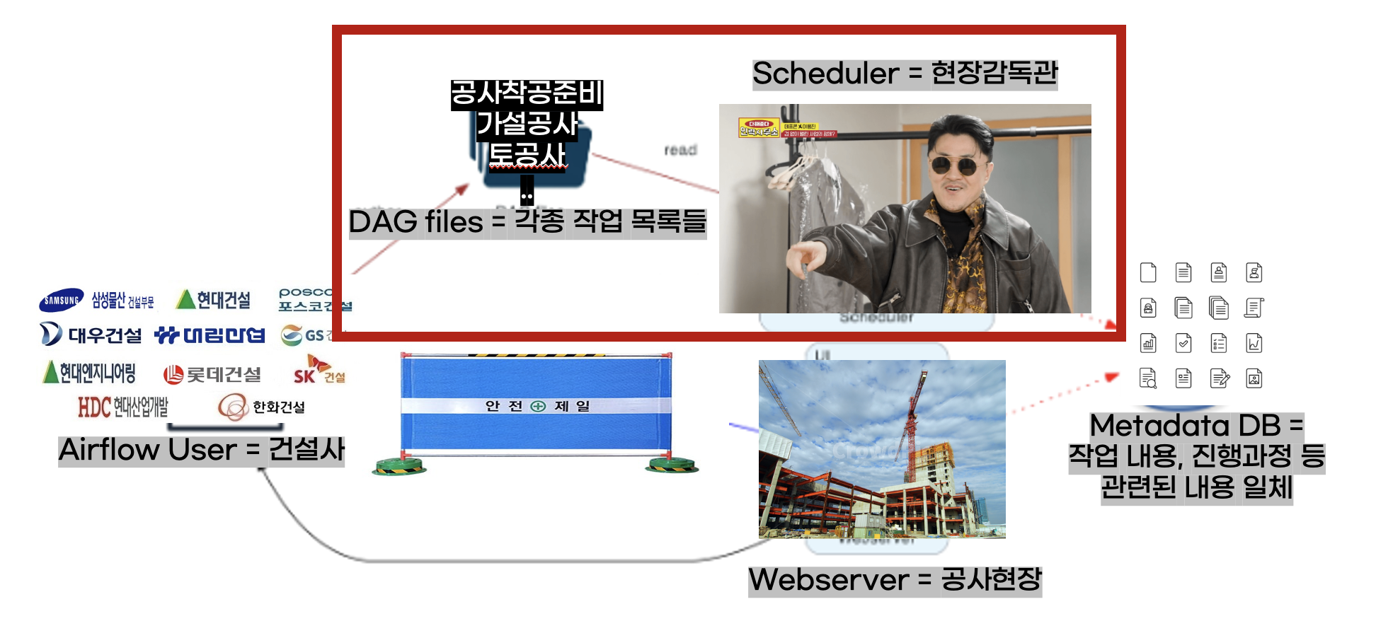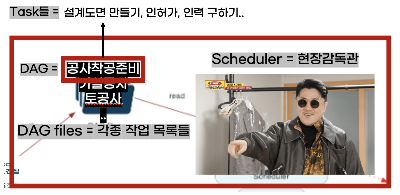 위 도식을 건설사의 건설 작업 현장으로 다시 생각해보자. User는 건설사에 DAG files는 각종 작업 목록들에, Scheduler는 현장 감독관에, Metadata DB는 작업 관련 사항 일체에, Webserver는 공사현장에 비유해볼 수 있을 것 같다(Plugin은 당장 이해할 필요는 없어 가림막으로 가림) 내가 여기서 설명하고 싶은 내용은 각종 작업 목록(DAG files)들을 어떻게 현장감독관(Scheduler)한테 넘기는지이다.