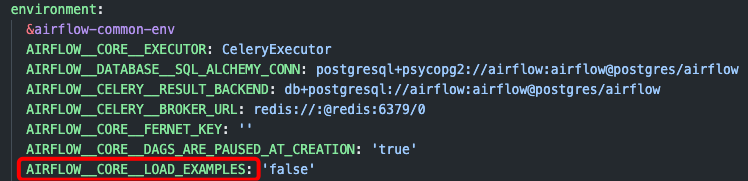 처음에는 Airflow 자체적으로 만들어져 있는 샘플 파일들이 한 가득 노출된다. 만약, 본인이 작성한 dag만 노출하고 싶으면, 아래와 같이 docker-compose.yaml파일 안에서 AIRFLOW__CORE__LOAD_EXAMPLES를 false로 바꿔주고 docker compose up을 실행하면 된다.